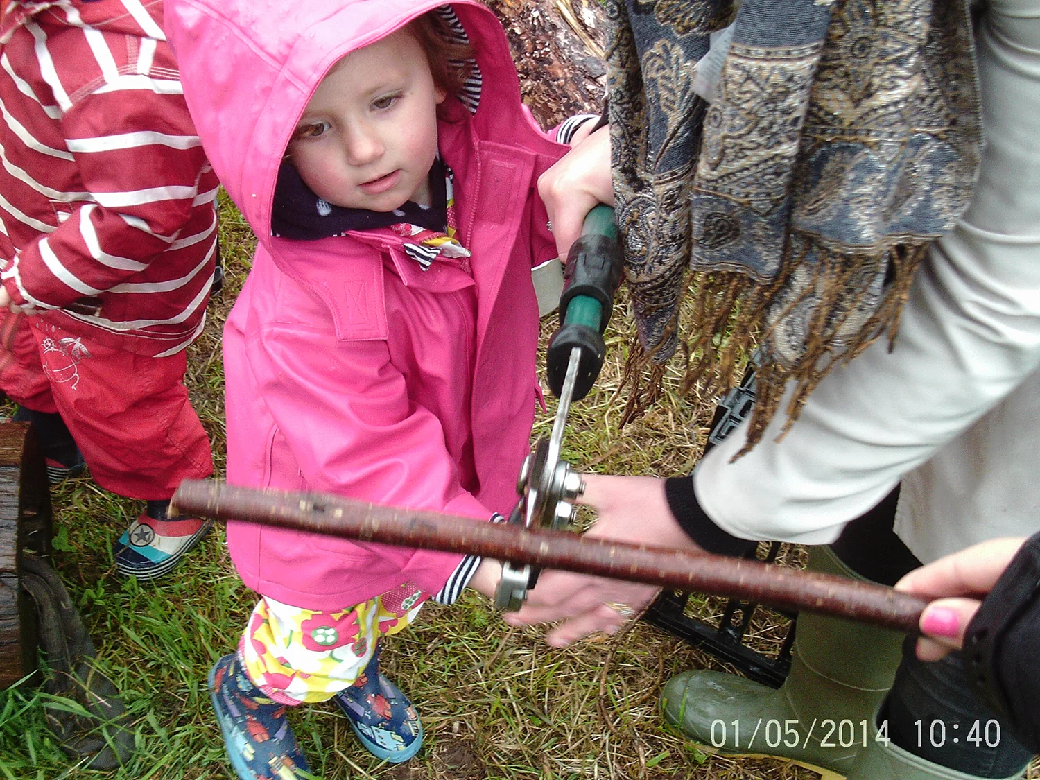 After this it was time to get going, one by one the children came to kneel down with an adult. We ensured the children held the loppers the correct way, we then led a stick down in front of us and guided the children to grip the stick in the jaws. SNAP! The children used lots of strength and force to cut the stick, “yay” some children said once they had cut the wood! A little boy who is just two said “more, more wood” and went to find more things to cut.