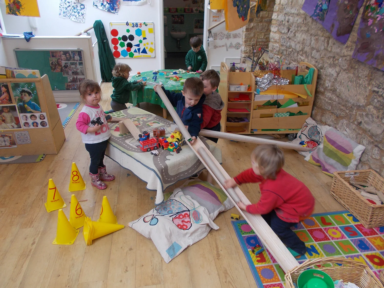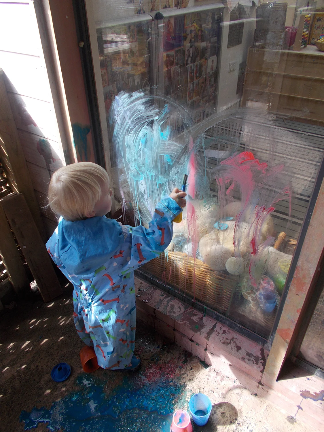 We’ve been busy in the Burrow too, making relationships with new and old friends, creating lots of art work, exploring under the archway using the water play, the role play, balls, guttering. Even an old cardboard box brings us much entertainment, one of the burrowers sat in it and said “It’s my car”, then another child replied “But it needs wheels.” So out came the pens and we drew on some wheels, we cut out a steering wheel and we were on our way!!