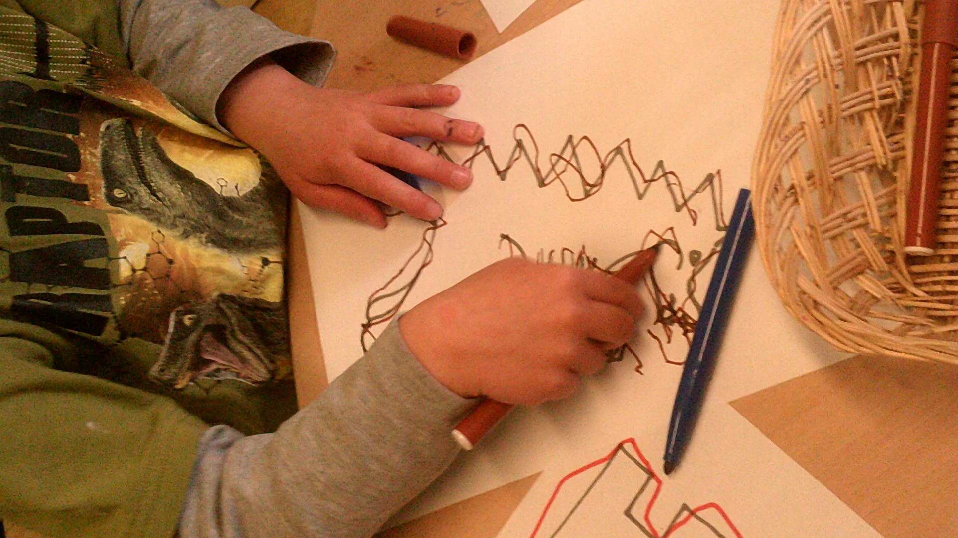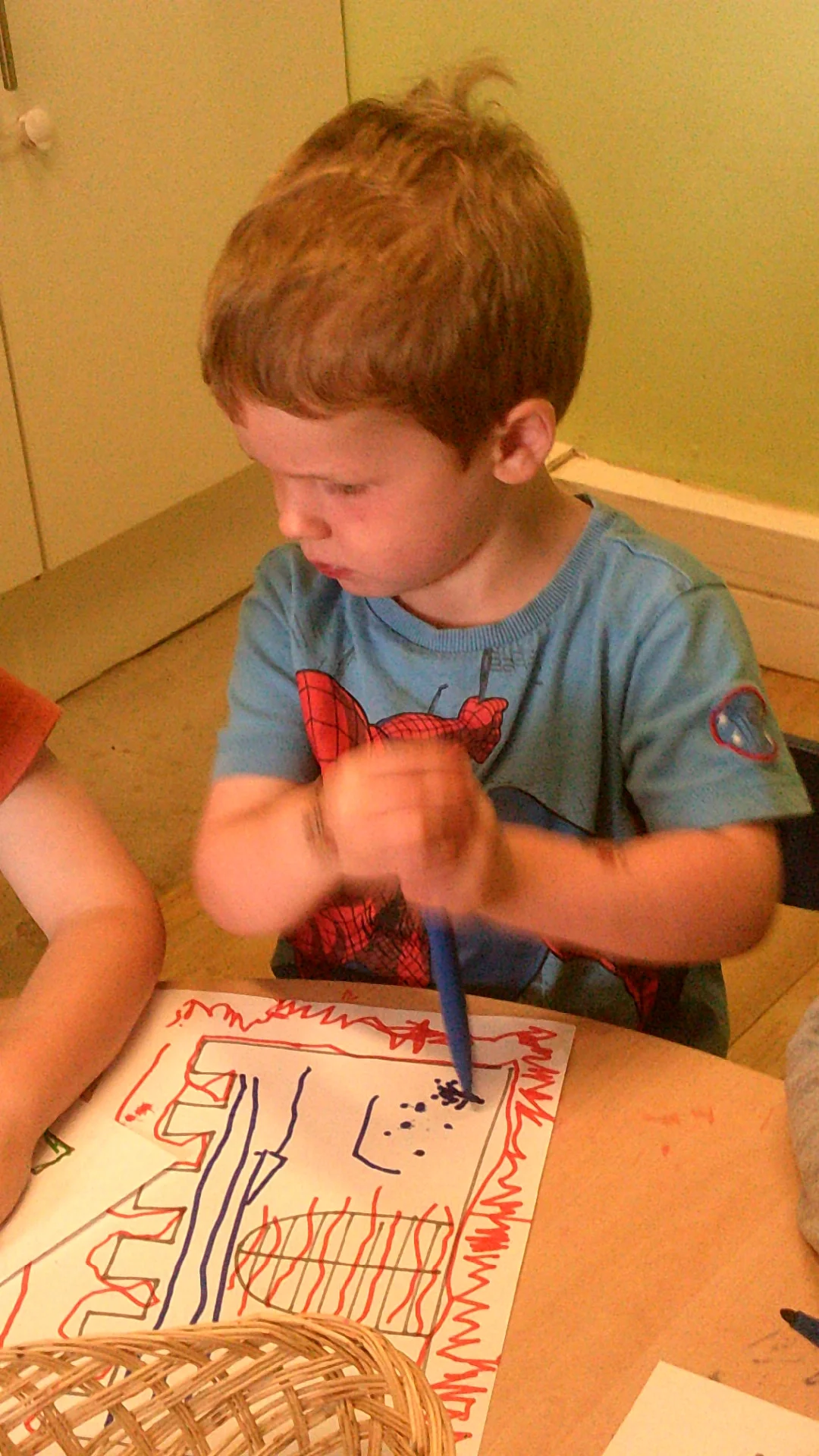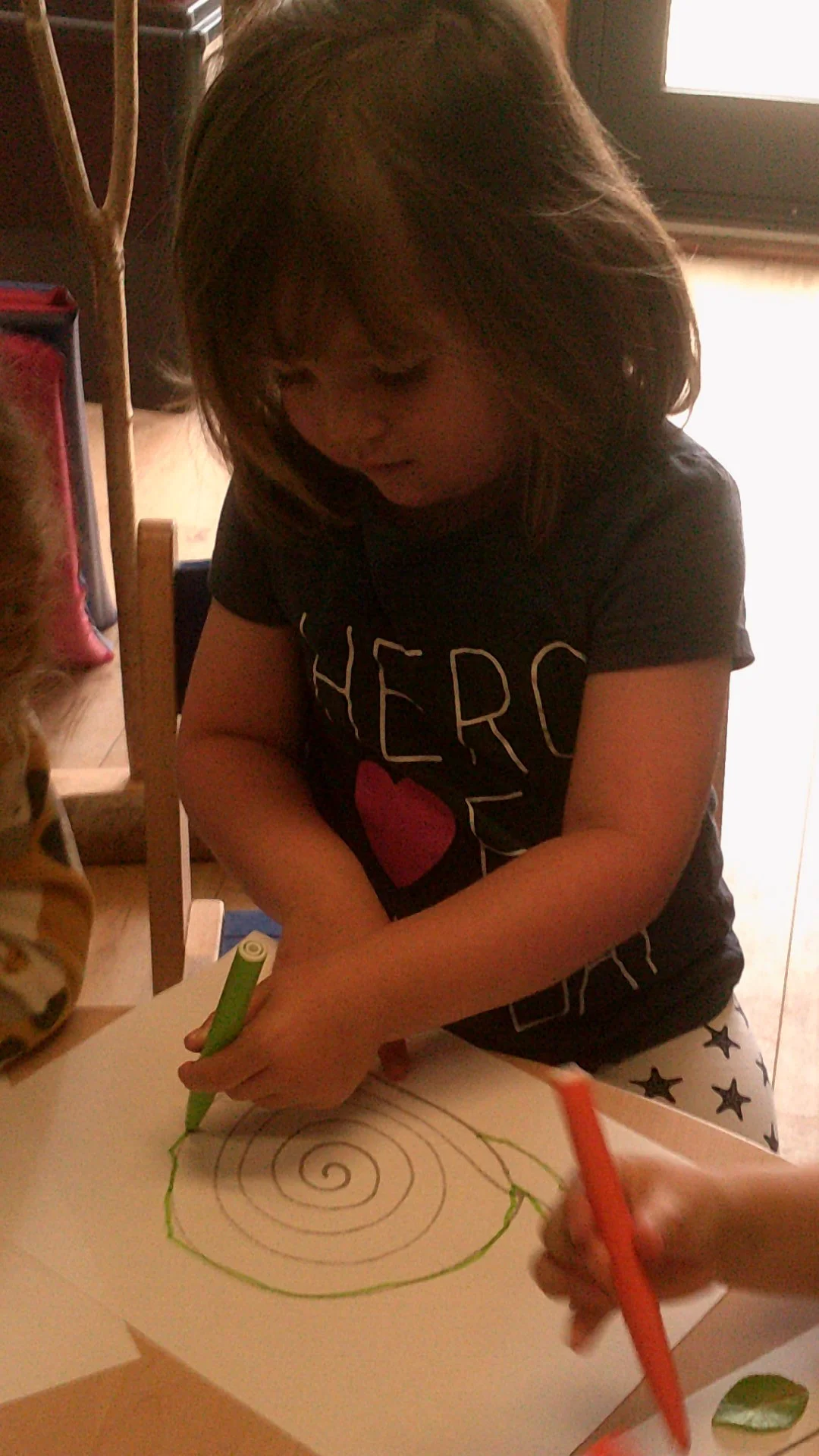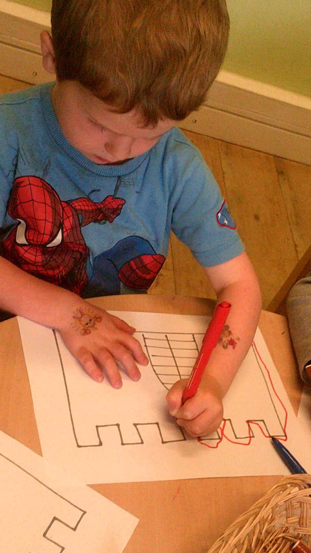 Children realise that marks can be used symbolically to carry meaning, in much the same way as the spoken word and begin to use marks as tools to make their thinking visible. Role play builders use chalk to make plans and pirates make their treasure maps resulting in an 'X' marks the spot! As children develop their mark making skills from lines and curves to enclosed shapes with features they can realise that marks can be used to relay information noticing letters and numbers in the environment and creating these themselves giving their marks meaning. Mark making oportunities are EVERYWHERE! Recently we have looked at patterns in nature, the spiral of the snail shell and the symmetry of the butterfly. During free play children have shown an interest in imaginary play, following their interests the colouring in sheets at the craft area reflect this and allow children to trace and explore patterns have a imaginary play theme.