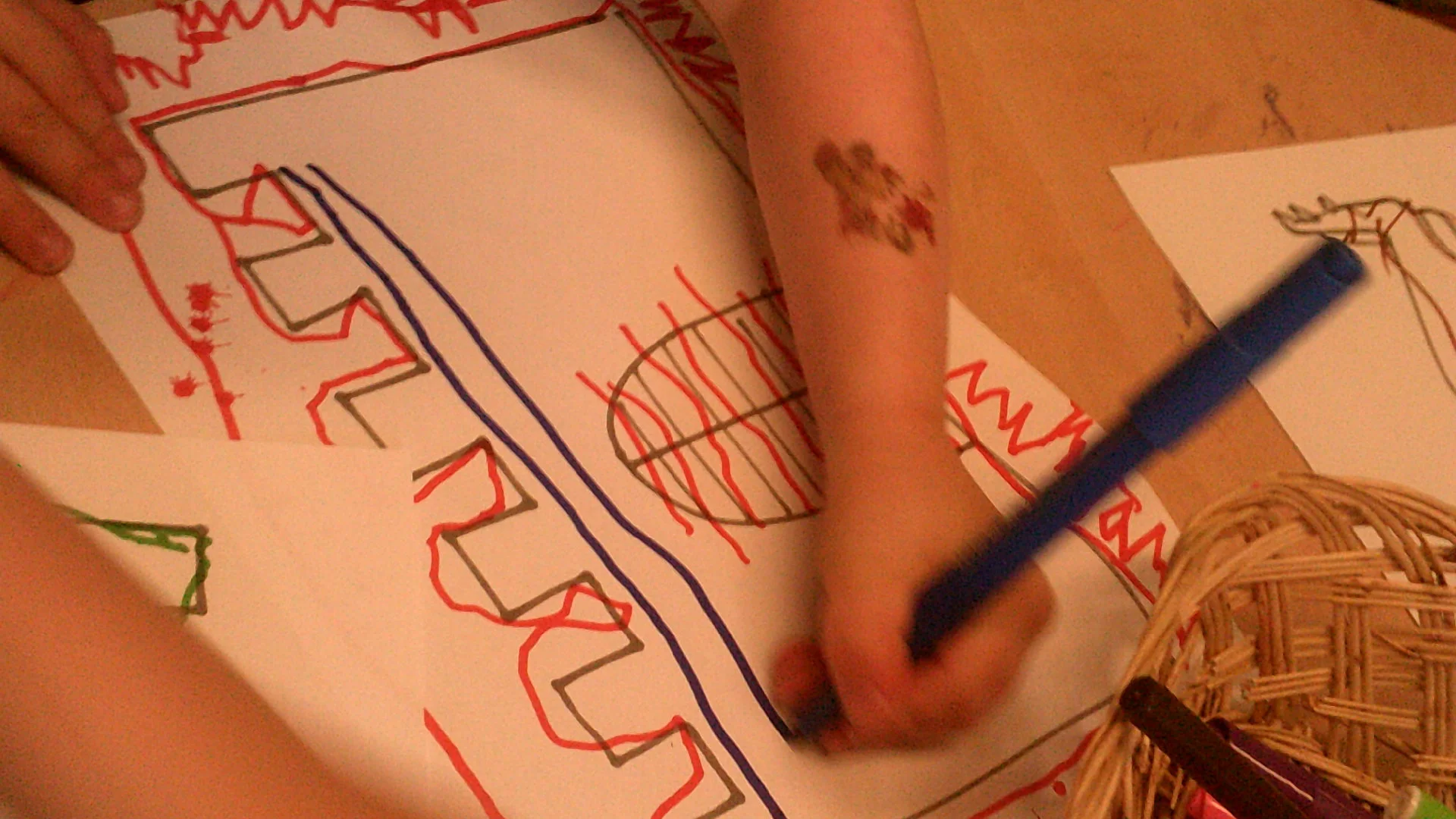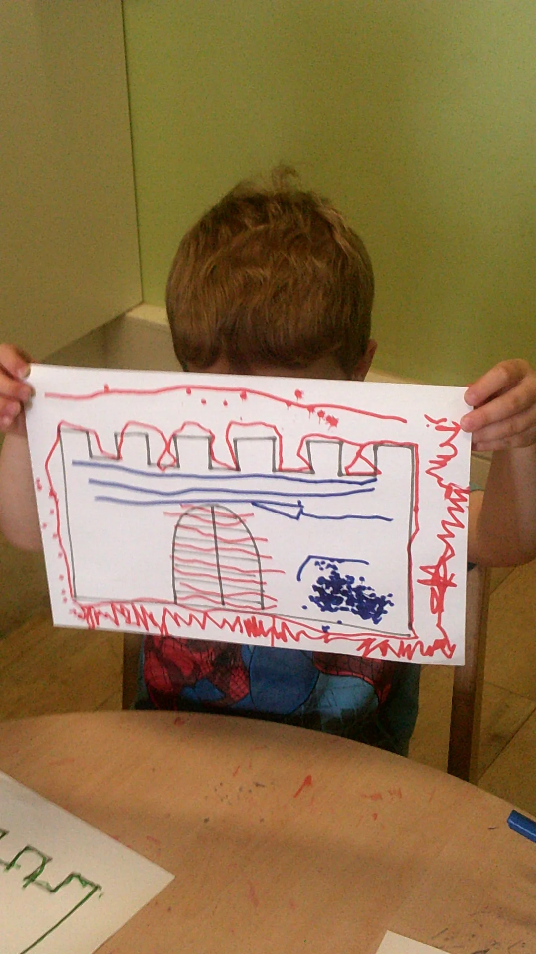 The feel of the bumpy chalk on the concrete path, sliding pens on the white board, fly swot painting or glue trickling onto paper or oozing through their fingers. Children often have no interest in an end product at all; the physical activity is an end in itself and an opportunity for them to experiment and explore with their senses, developing confidence and dexterity through the process. At other times children may take delight in using their mark making to tell stories and express their feelings through pictures and symbols of increasing sophistication. They may decide that their mark making only tells half the story and choose to provide a full narrative which they invite the practitioner to ‘scribe’.