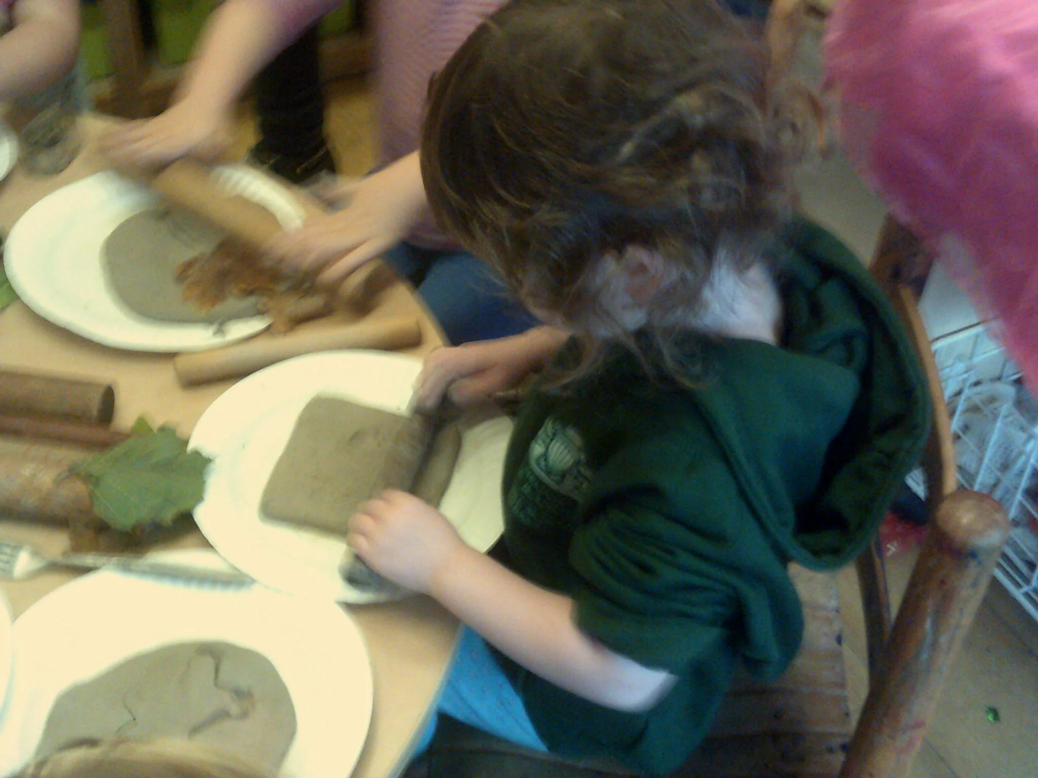 The children were guided, and shown how to roll their clay using a rolling pin and how to use tools, such as a fork, to make marks in the clay. Also, it was brilliant to see the children using natural resources to make marks as leaves and pine cones were available for the children to use to print into the clay.